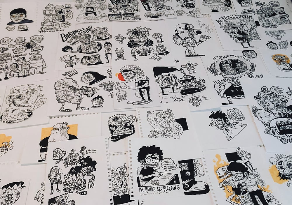 Five pages of inked illustrations, varying in size, all on canson mixed media rough paper. Normally individual pages are sold at a minimal of $20 each in person or $25 online. Everything can be framed. Shipped in a sealed mailing tube.